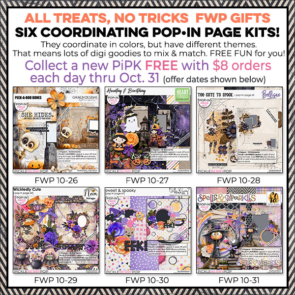 各日、8ドルご購入頂けるとこれらの POP in Page Kit (編集可能なクイックページ付きミニキット) が無料でついてきます。それぞれ24時間限定です。要するに6日連続8ドルづつ何かを購入すれば、6つすべて手に入ります。6個のトリート、集めて楽しんでくださいね 🙂 ちなみに、購入はPBP内のものならなんでも大丈夫です。